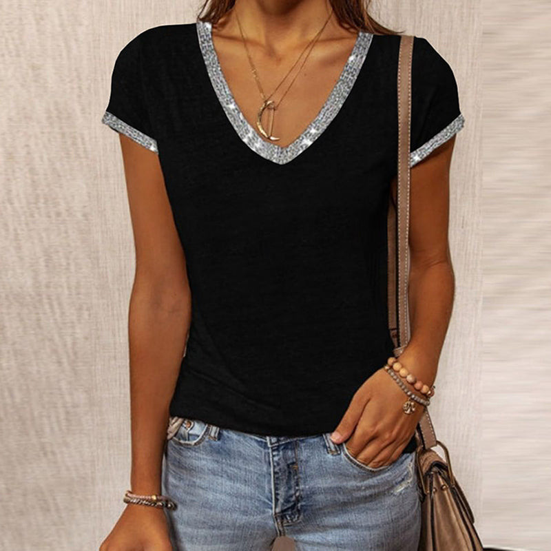 V Neck Shiny Contrast Color Casual Fashion Women’s T-Shirt